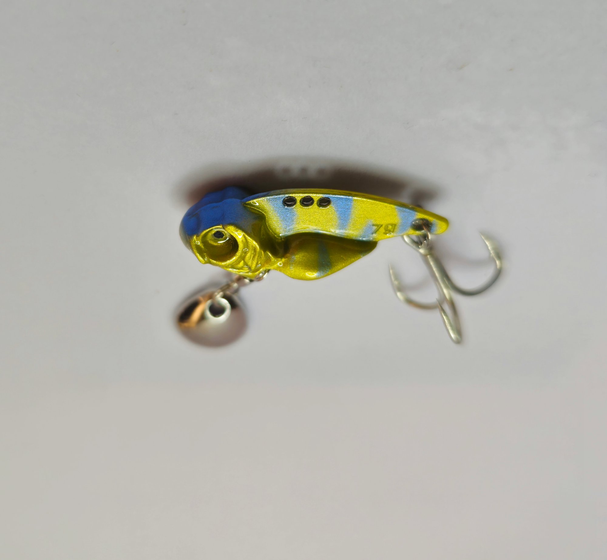 Stable Descent: The weight is concentrated in the head/belly area, which allows the lure to drop straight down without tangling, while the tail blade spins on the way down.