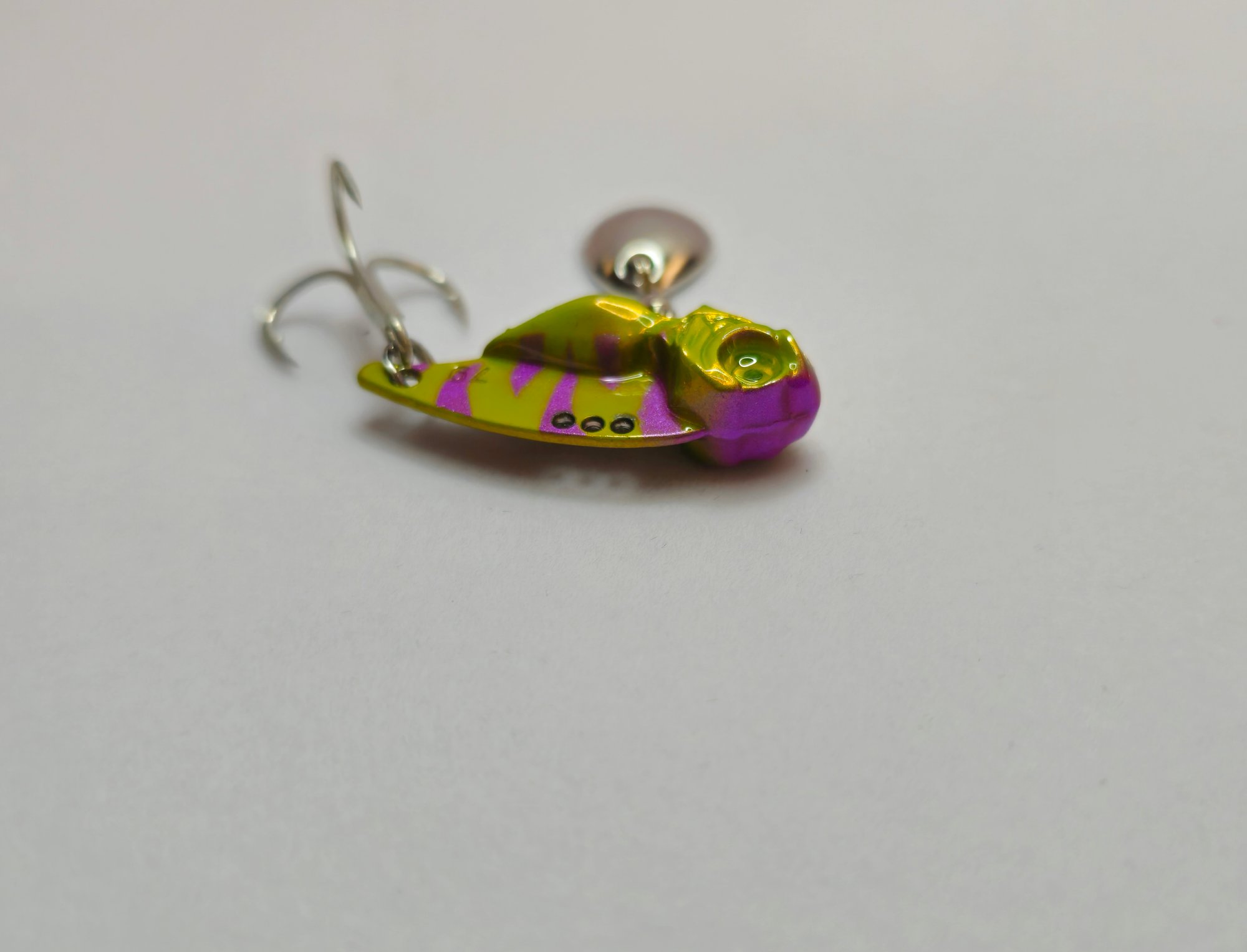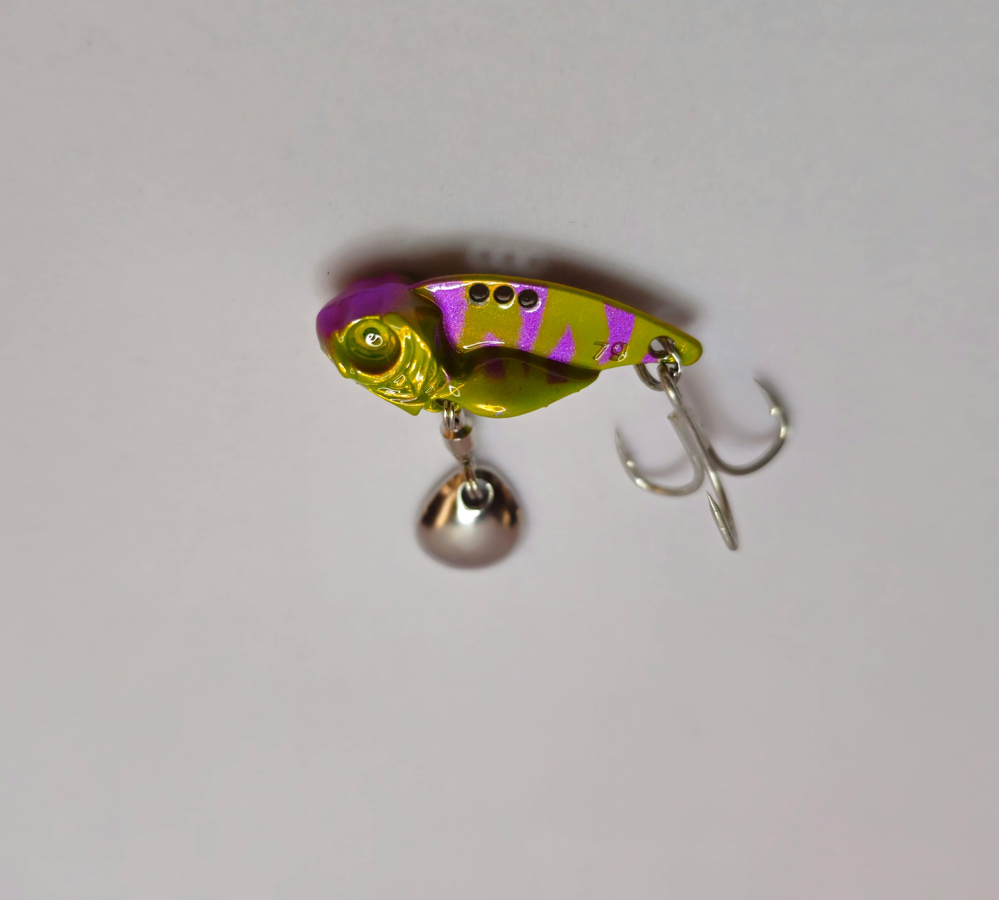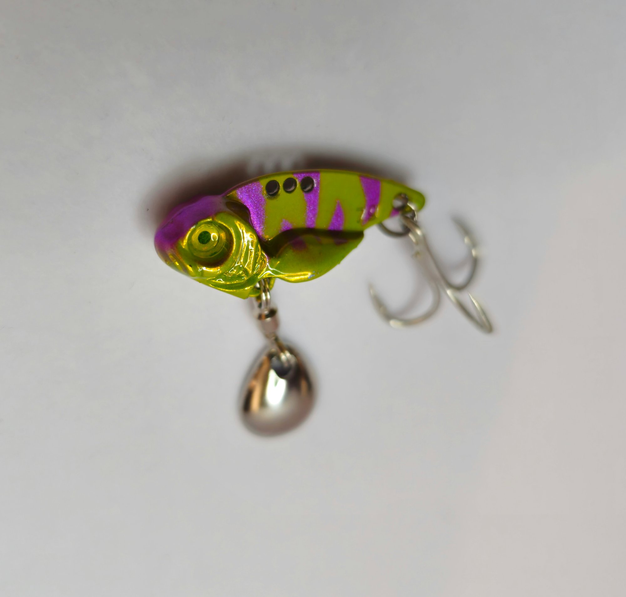 Stable Descent: The weight is concentrated in the head/belly area, which allows the lure to drop straight down without tangling, while the tail blade spins on the way down.