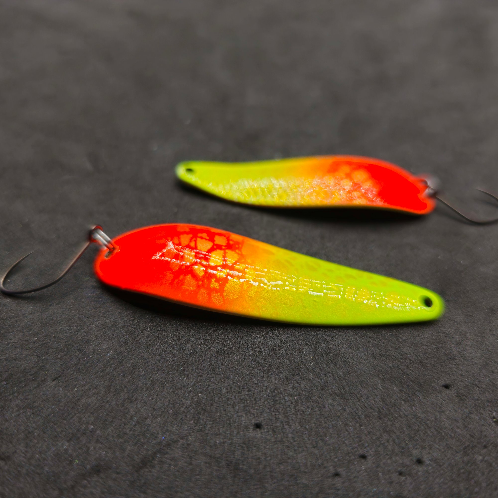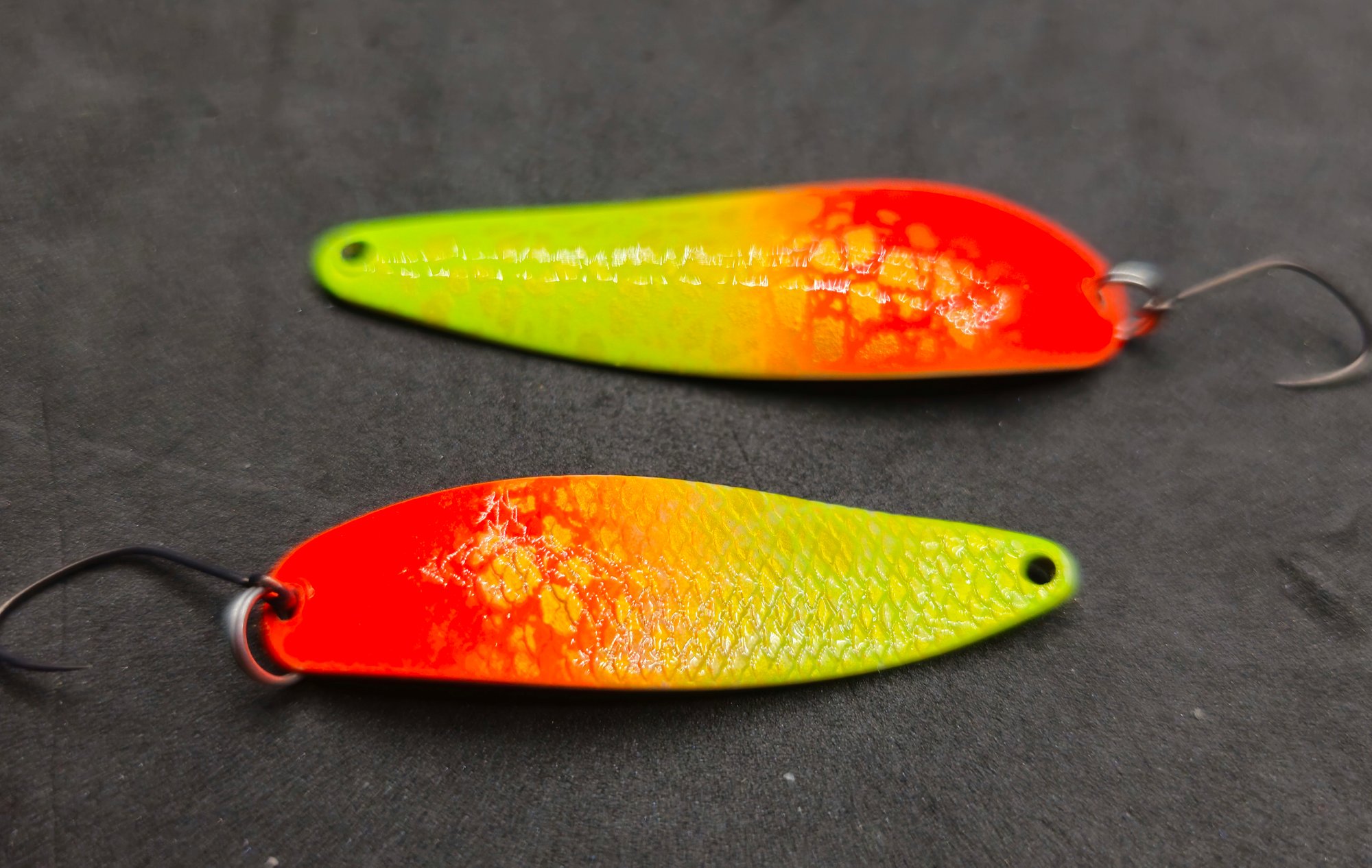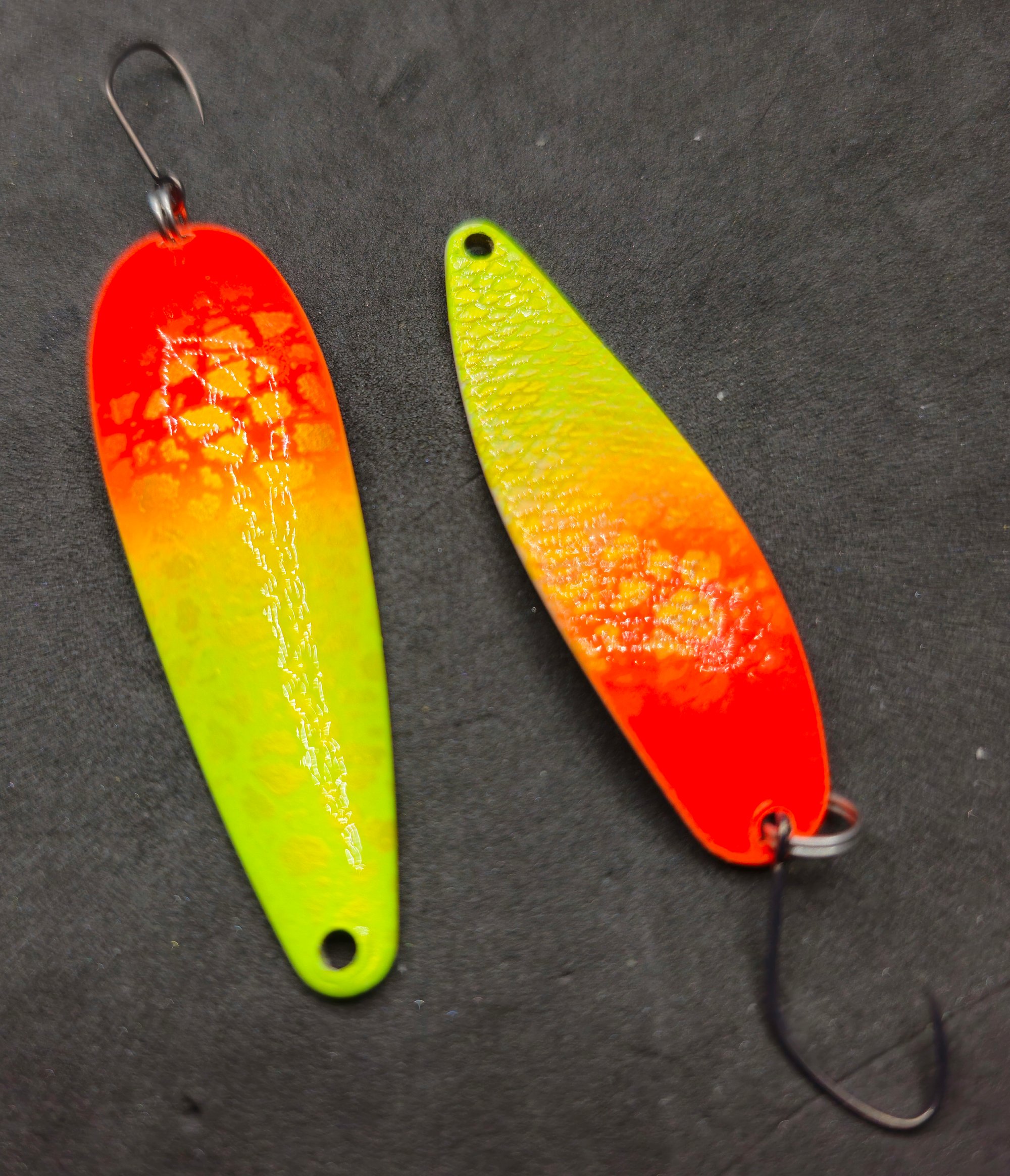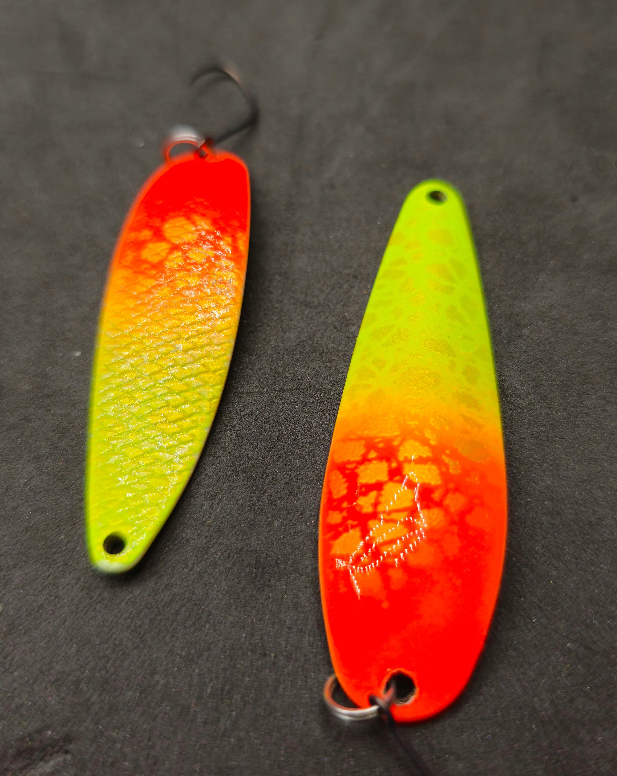 The "Cracked" Texture: If you look closely at the orange section, there is a subtle "cracked" or reptile-skin pattern. This breaks up the light reflection, creating a more complex "flash" that can trigger strikes from cautious fish.