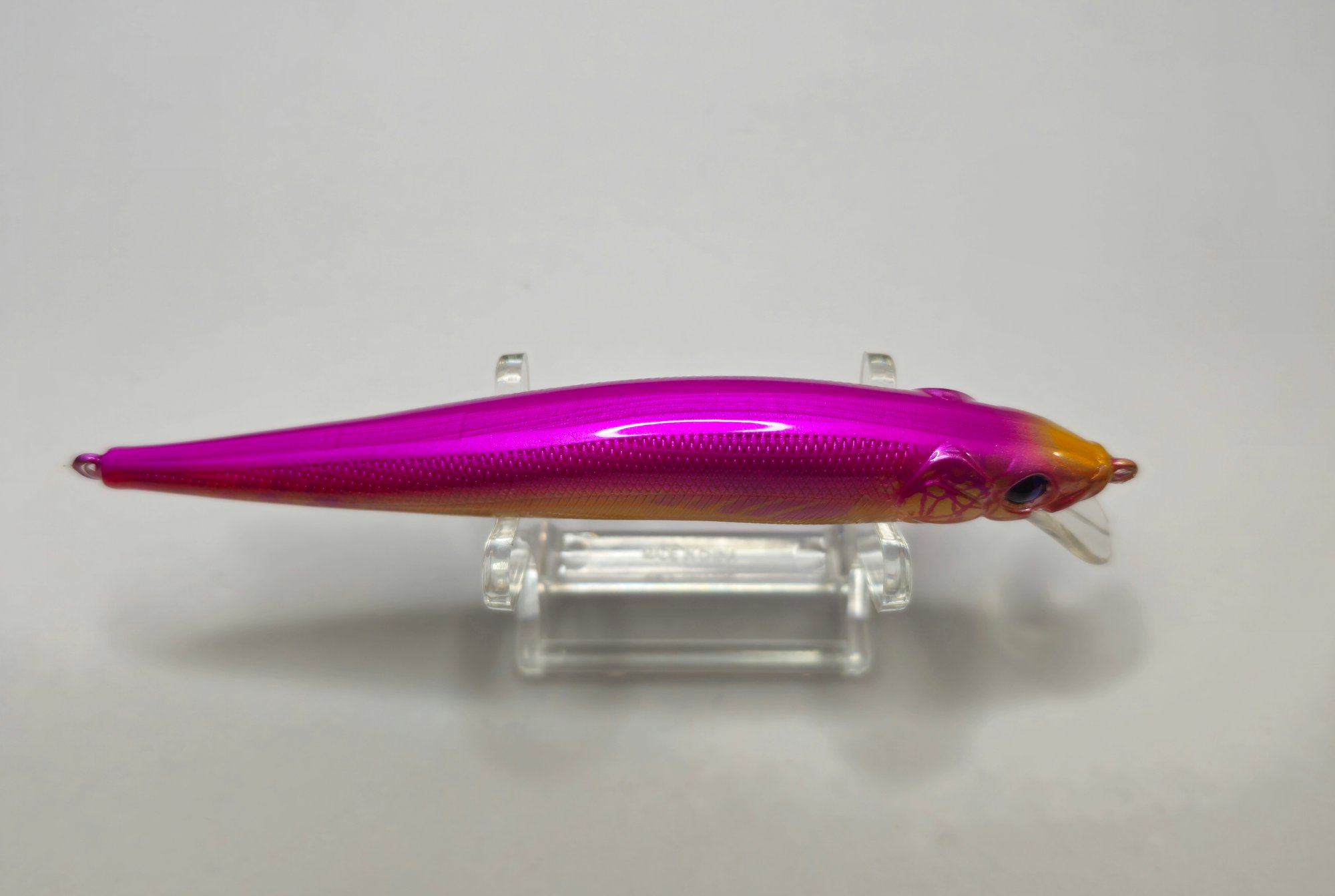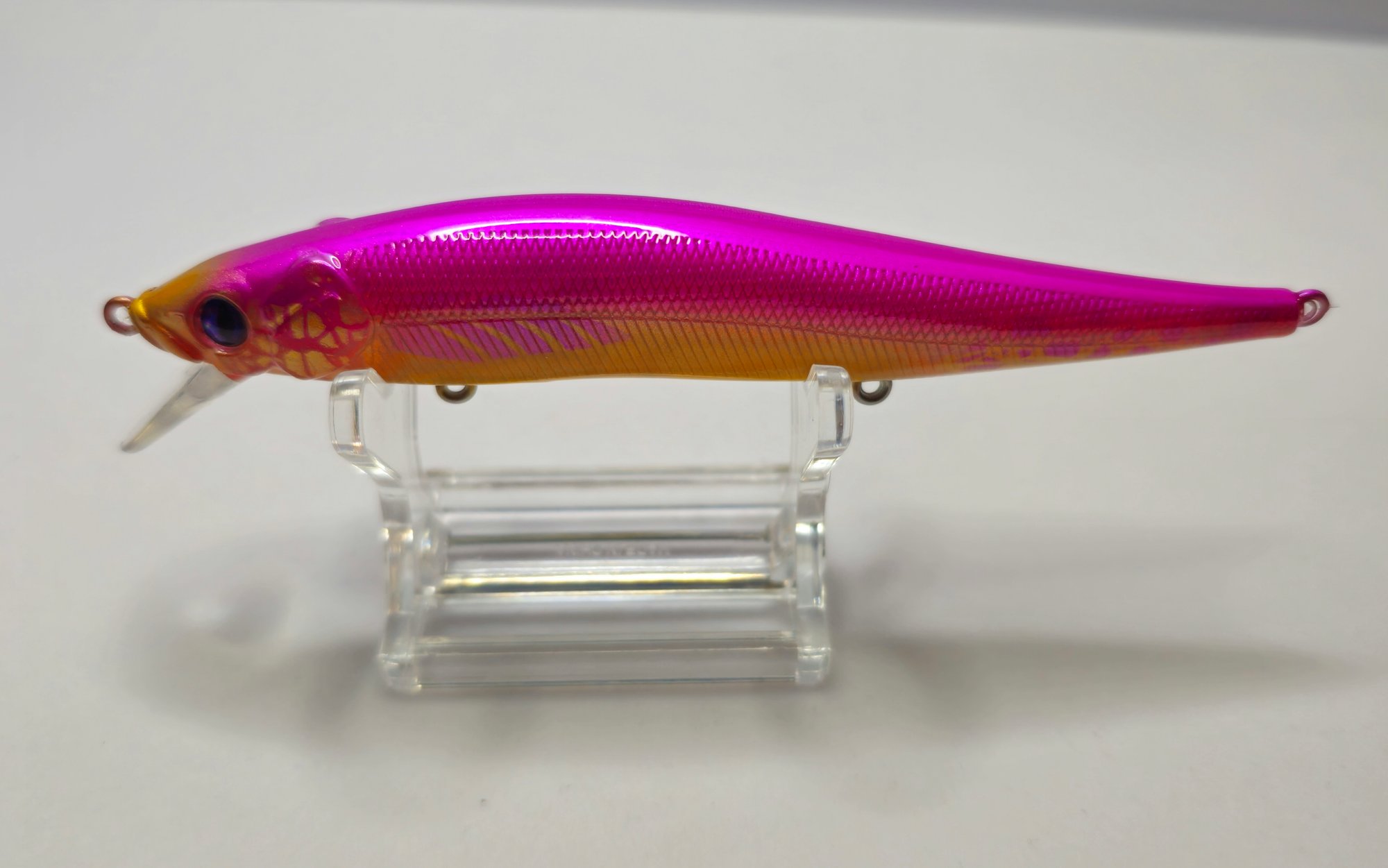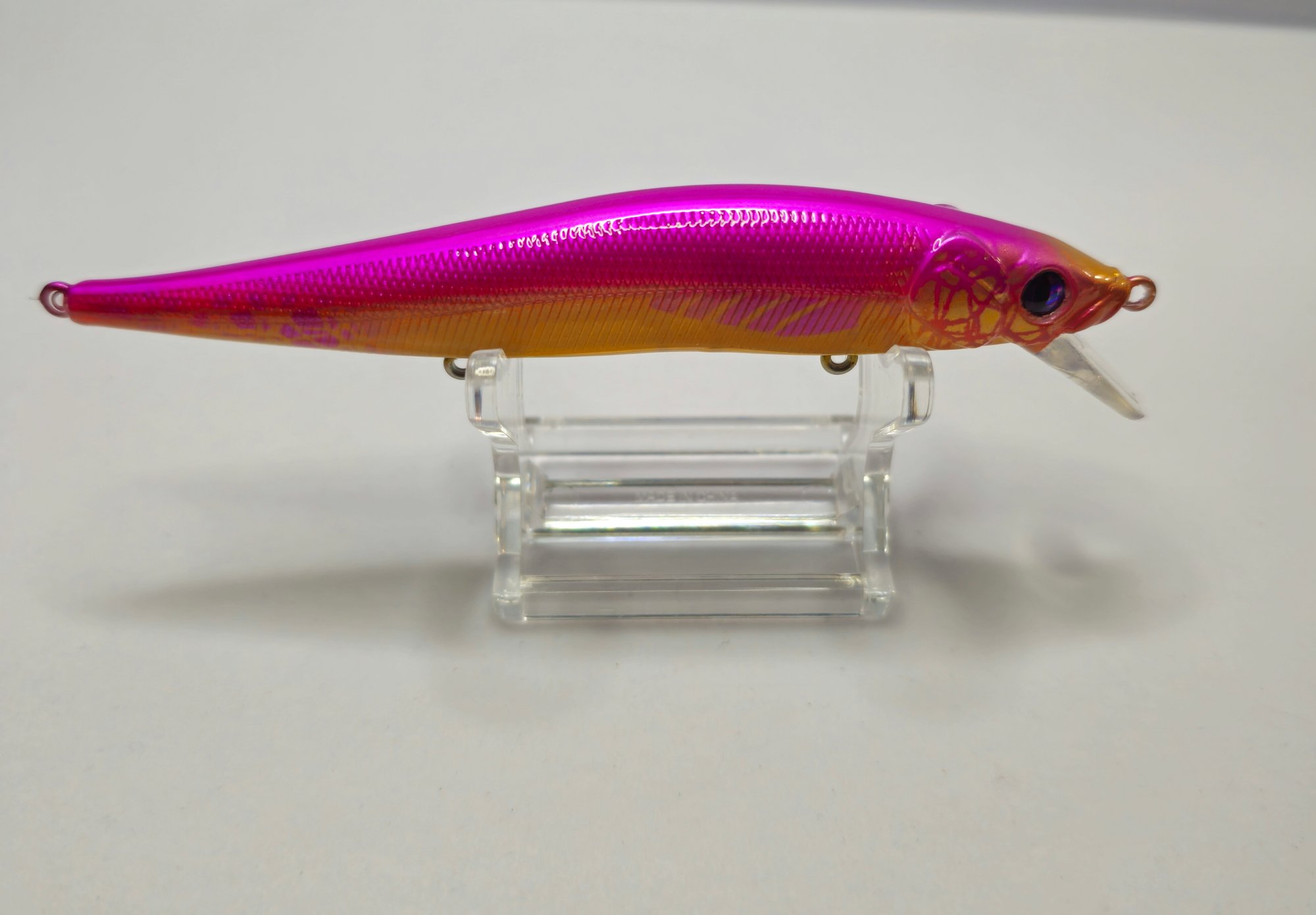 The small, narrow clear lip indicates this is a shallow-running (SR) jerkbait.