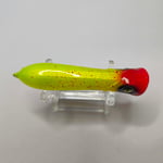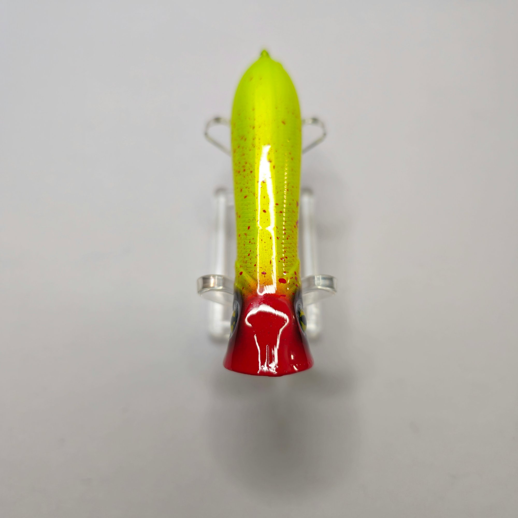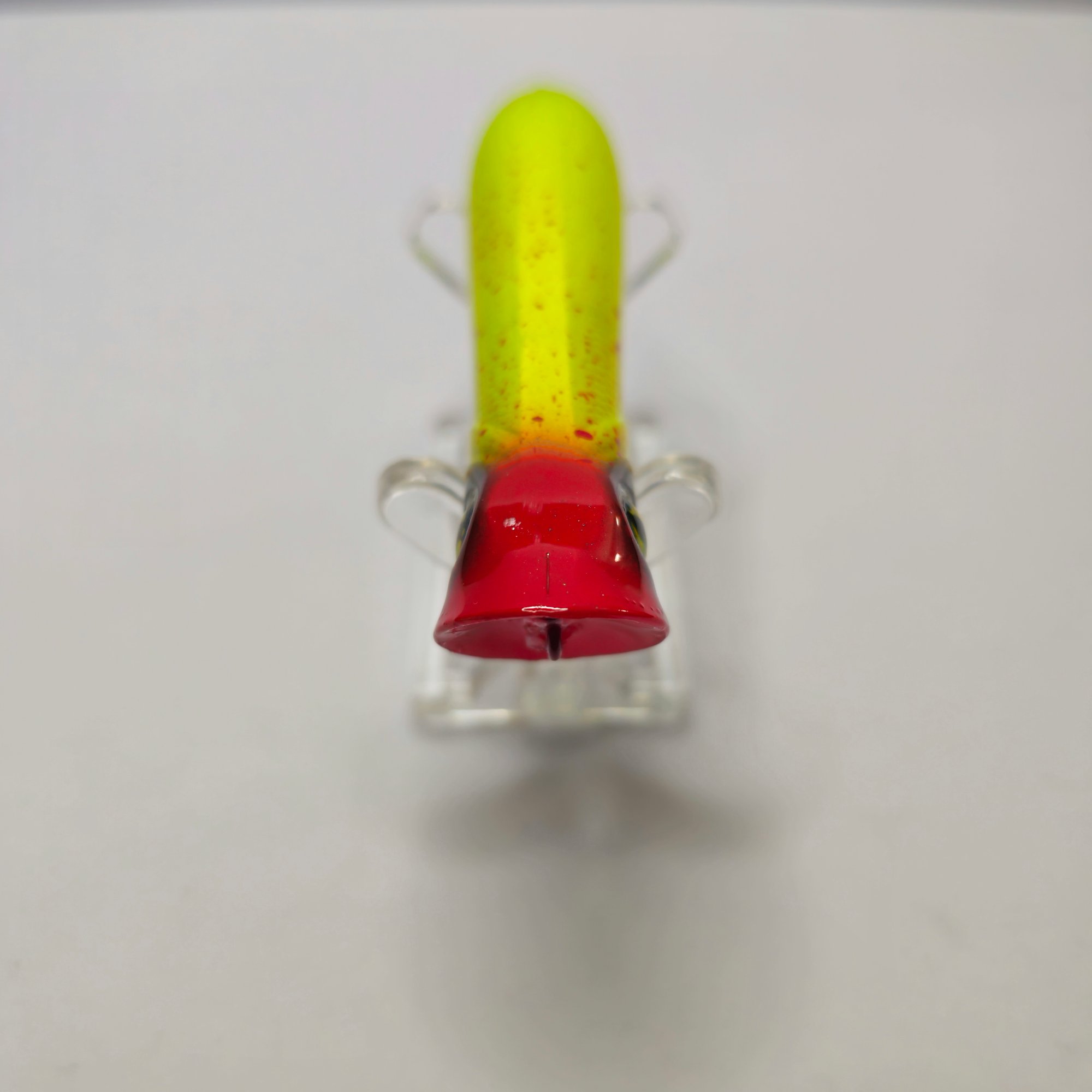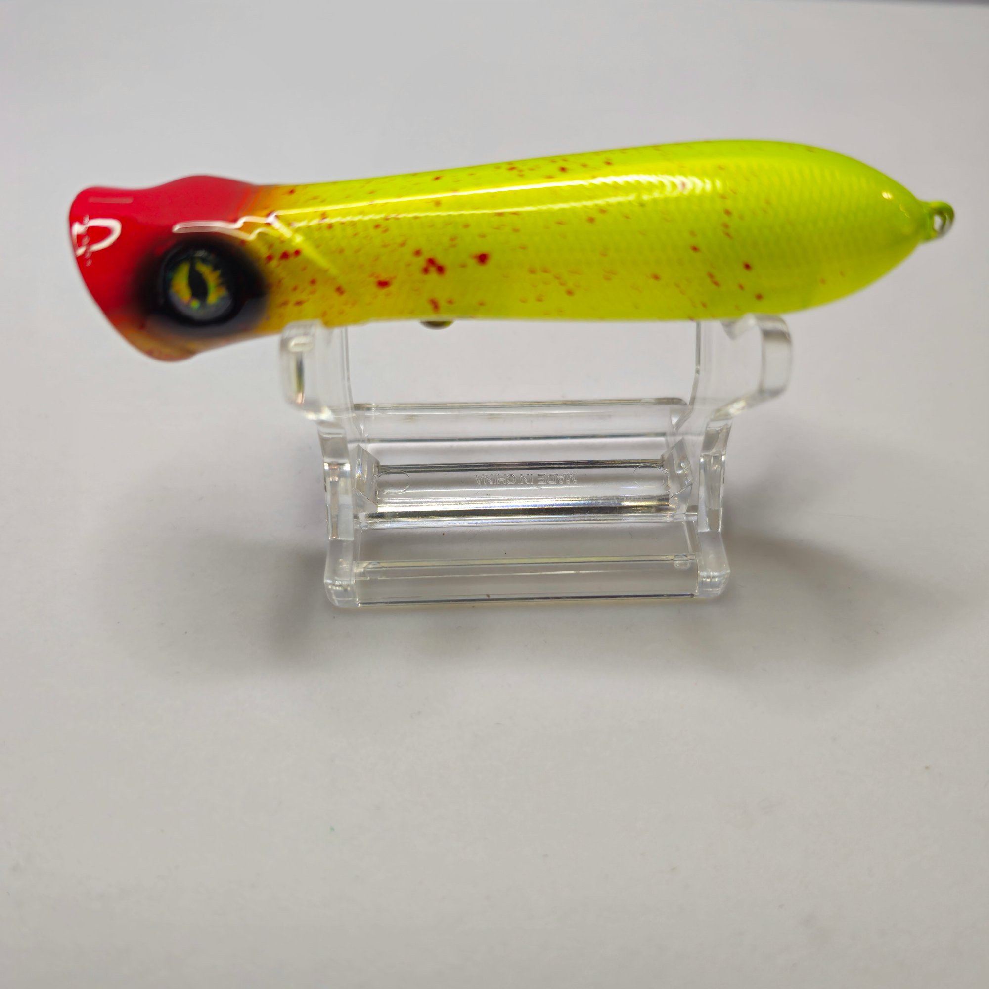 At Rest: The lure will sit on the surface of the water, usually with its tail angled slightly down and its "cupped" face at or just above the waterline.